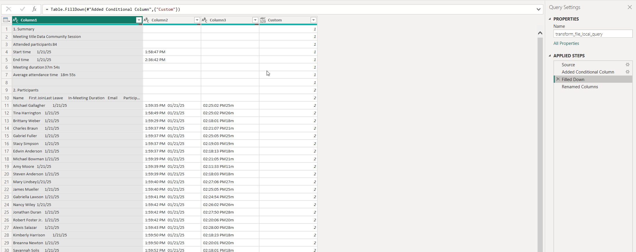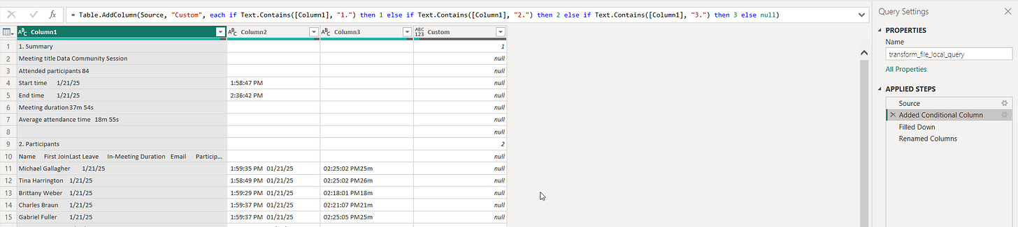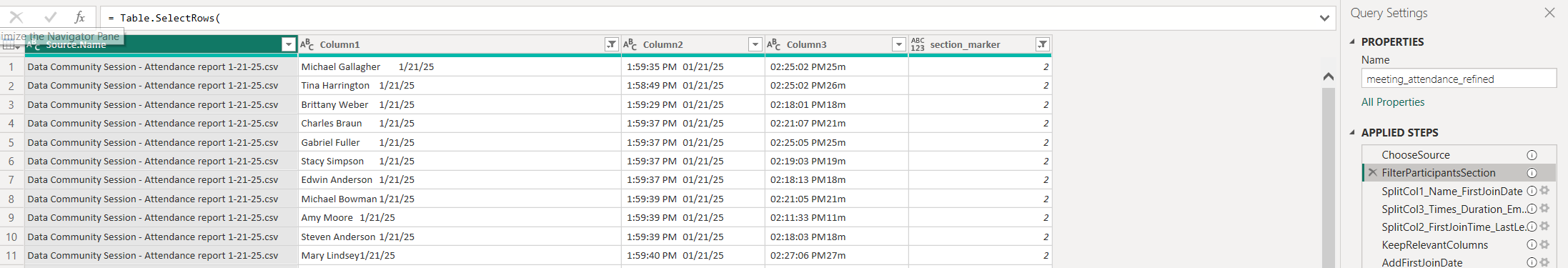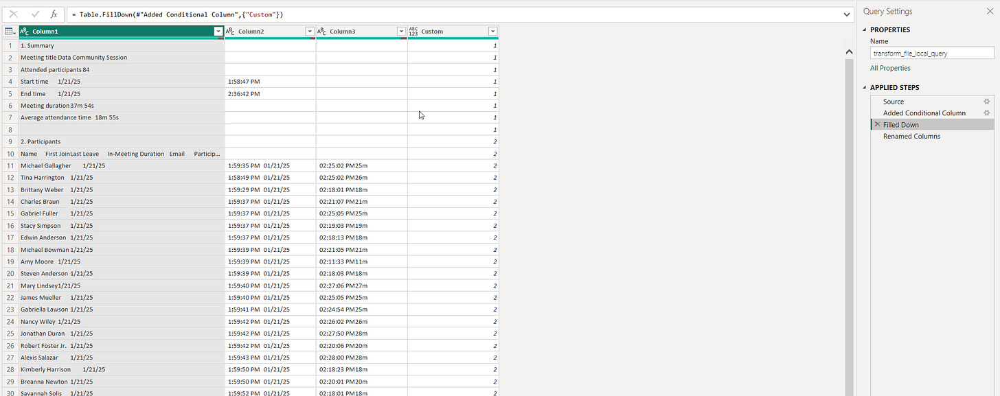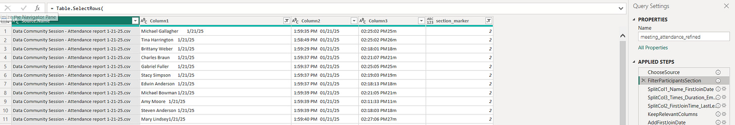 The one bit of secret sauce from Power Query I’ll share is the bit where you dynamically identify the section of an attendance report to only pick the Attendee details.