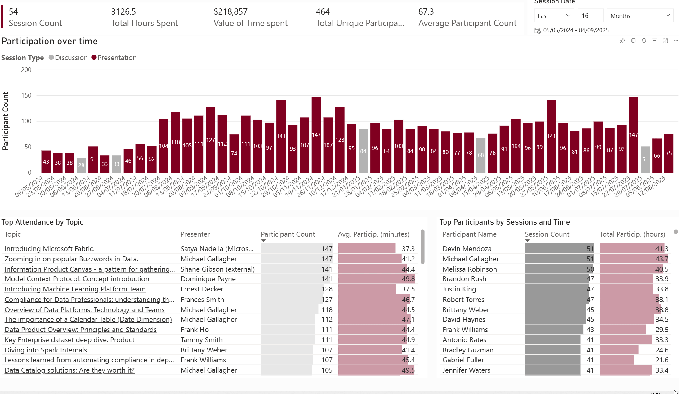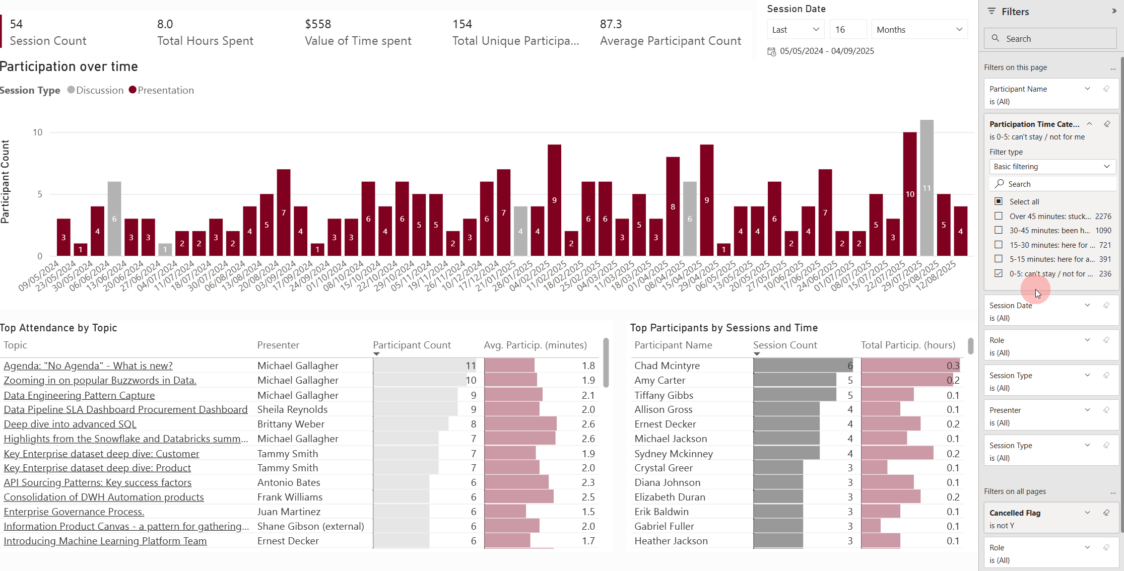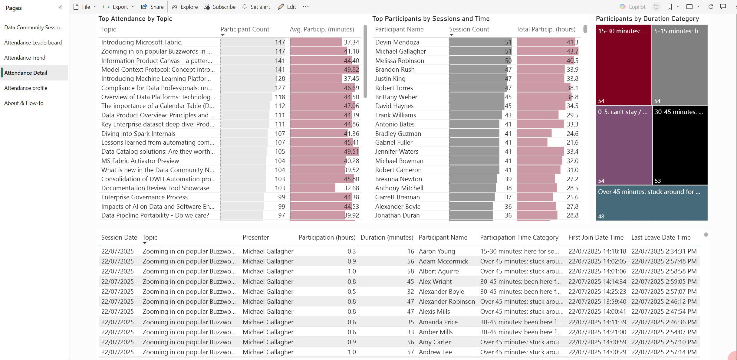 Zooming in on the customers/stakeholders of the data community. By Session count or Participation time - top or bottom - all available on the same page using just a couple of clicks: