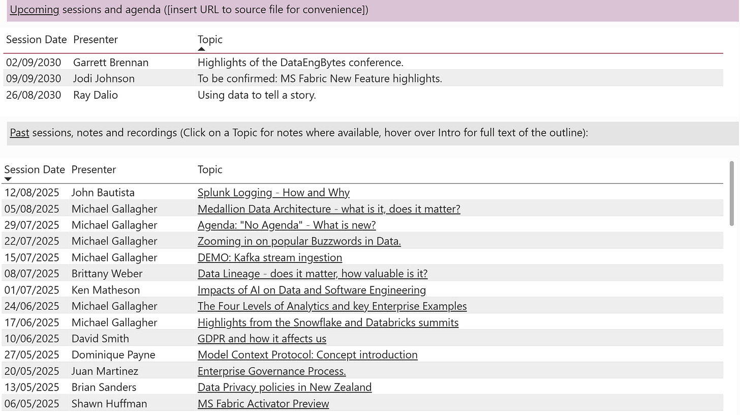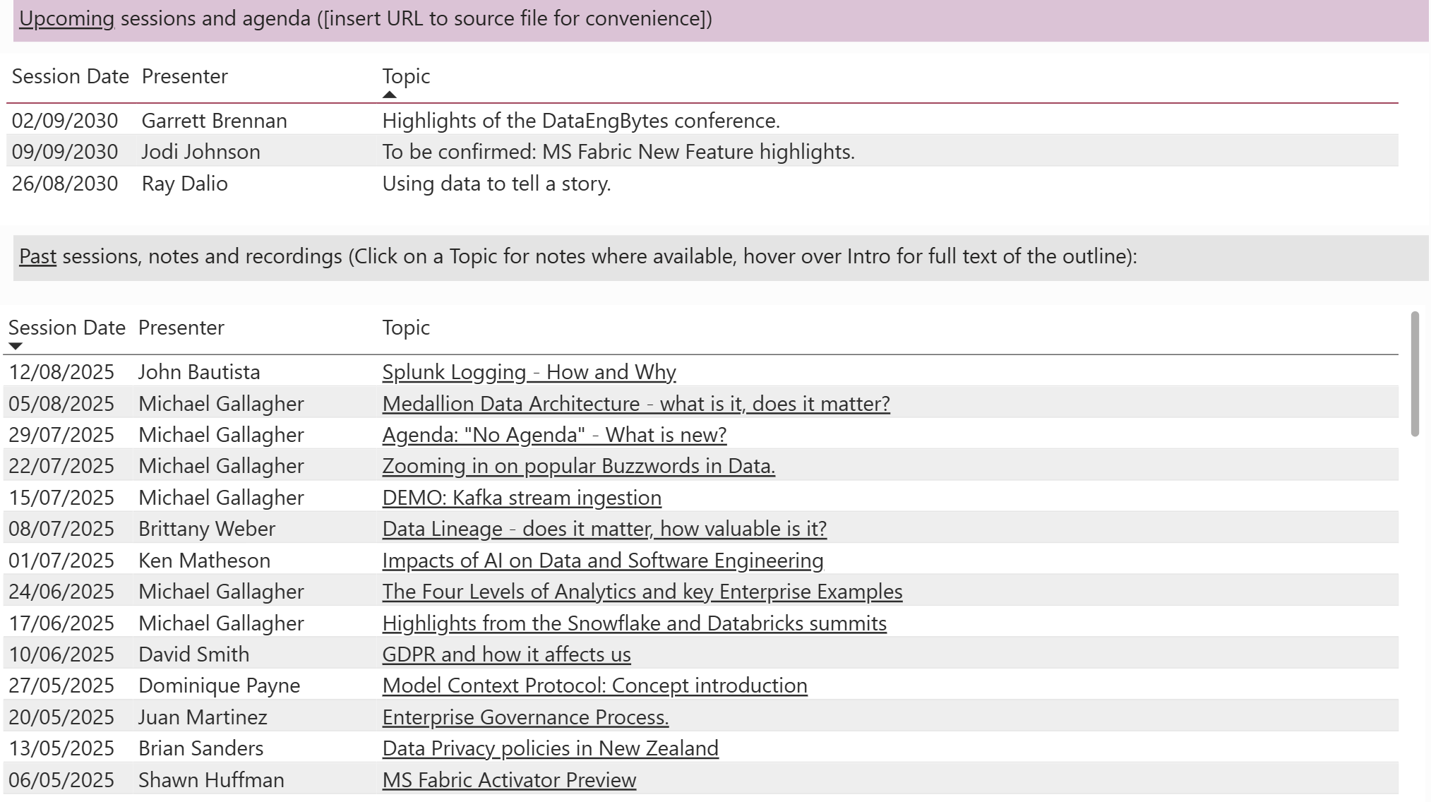Where available, past Topic items become a hyperlink to session notes or recording.