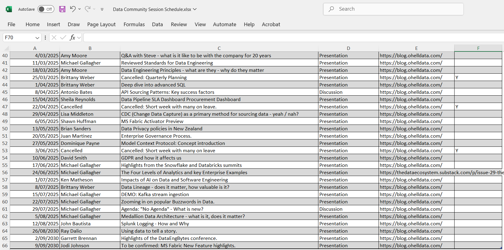 Session schedule. I use a simple Excel Workbook with a table (Ctrl + T), which is recommended for Power BI import (so that Power Query knows the boundaries of where data begins and ends):