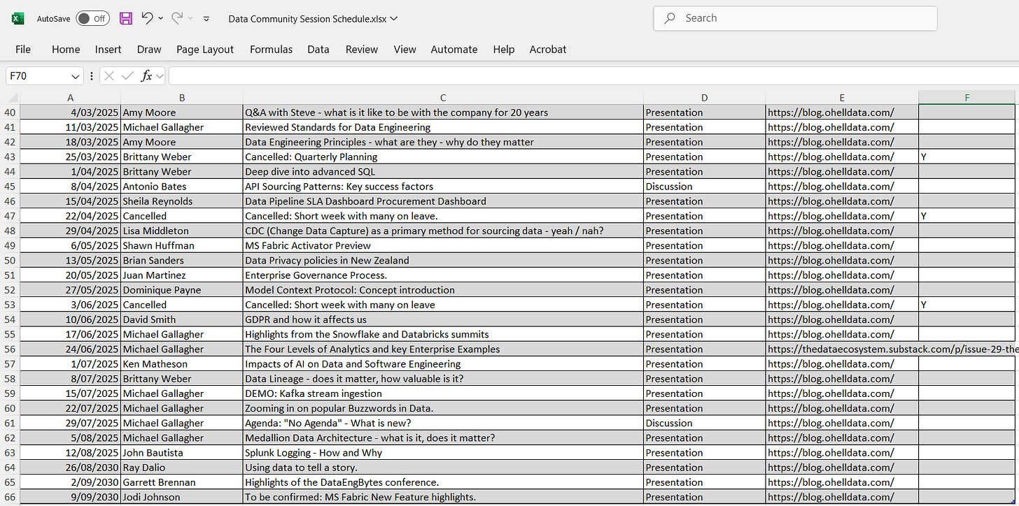 CTRL + Click to select the highest attendance bars and the common theme reveals itself - sessions to do with “fun” (buzzwords), external guests (Microsoft, AgileData) and trendy topics like Model Context Protocol.