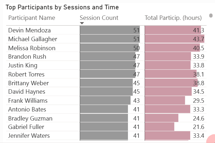 Alternatively, we can scroll up / down the session list, which is already sorted by Participant Count by default. Or sort it by Participation minutes if we please: