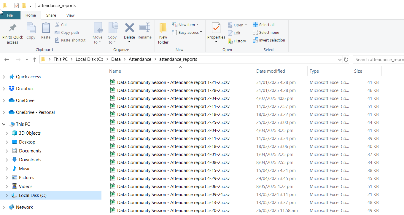 Attendance report CSV files are all collocated in a single folder to allow Power Query to iterate and automatically pick up new ones: