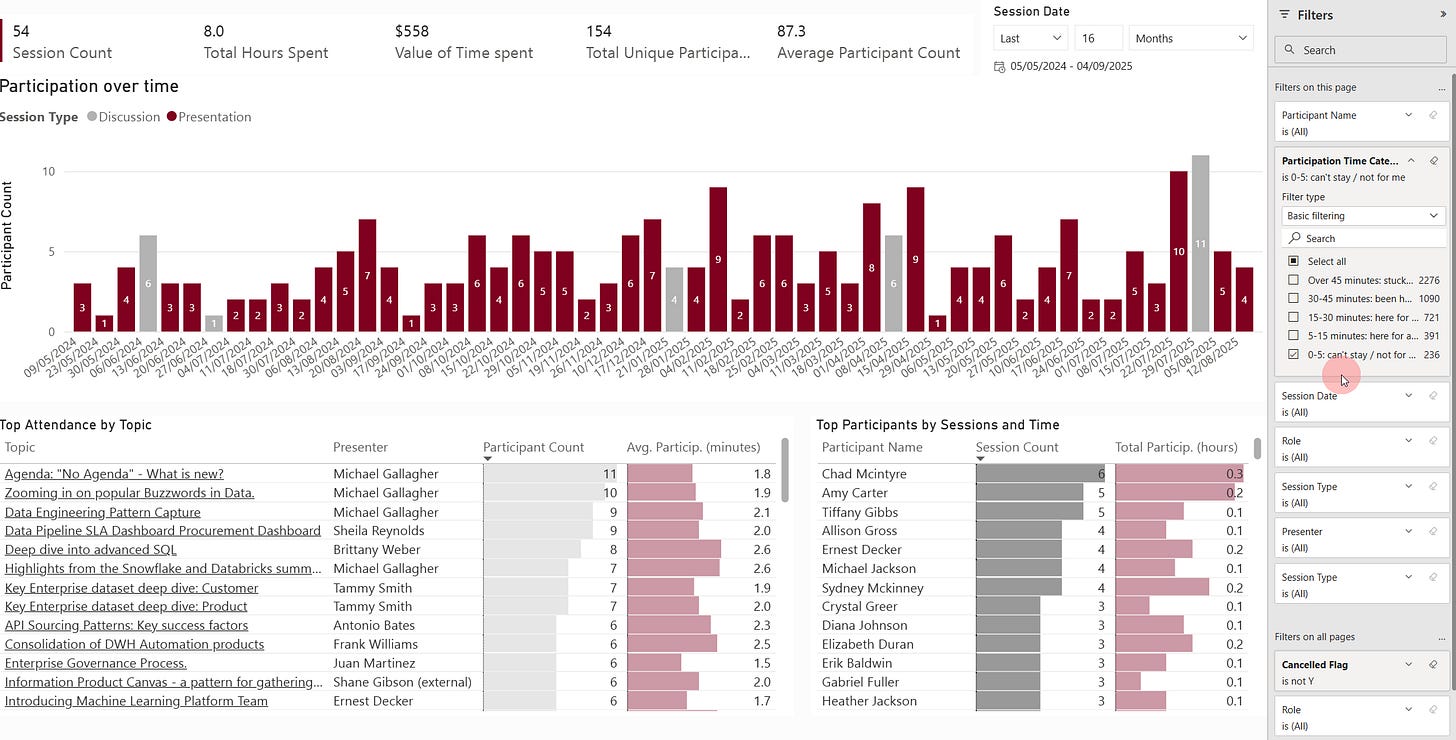 In the snippets and GIFs above, you would have noticed a couple of touches - such as expressing the overall attendance in monetary terms (that is, the opportunity cost of folks attending - keeps me honest in ensuring topics add value), high-level stats and other pages that offer alternate slices across the data.